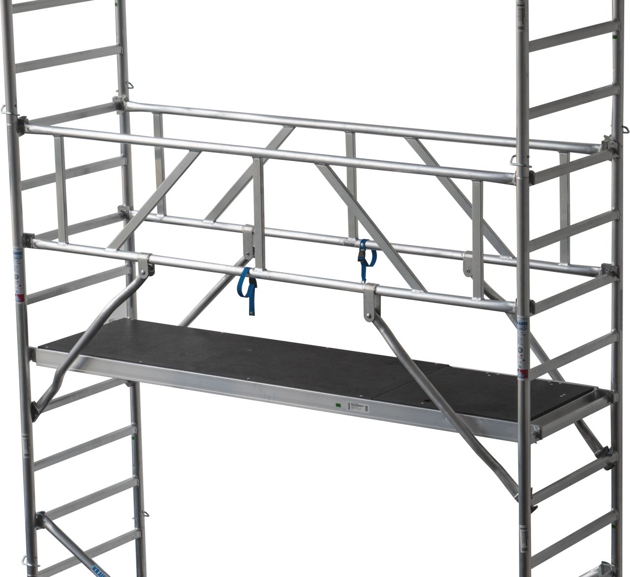 + Die Integration der Diagonalen in das GuardMatic-System gewährleistet eine einfache und sichere Montage. Für Transport oder Lagerung kann der Geländerrahmen platzsparend zusammengefaltet werden