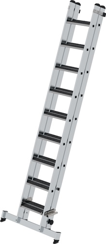 2-teilig aus Aluminium · stabile Rechteckrohr-Holme · 80 mm tiefe Stufen mit Trittauflage clip-step R13 für zertifizierte Rutschhemmung · 4-fach gebördelte Stufen-/Holmverbindung · einfache Höhenverstellung und sicherere Arretierung von vorne durch seitliche korrosionsbeständige Steckbeschläge · extra breite Standfläche von 170 mm Tiefe im Überlappungsbereich der Unter- und Oberleiter · Oberleiter mit Leiterkopfsicherung (Klettband) zur Befestigung an Dachrinnen o.ä. · Unterleiter mit nivello®-Traverse für einen extra sicheren Stand und Aufstieg · Oberleiter mit nivello® Leiterschuhen, da zur Einzelnutzung entnehmbar · max. Gesamtbelastung 150 kg Die nivello®-Traverse liegt lose bei und wird zweifach am unteren Holmende verschraubt. Die Trittauflage wird bis zur maximal begehbaren Stufe aufgebracht.