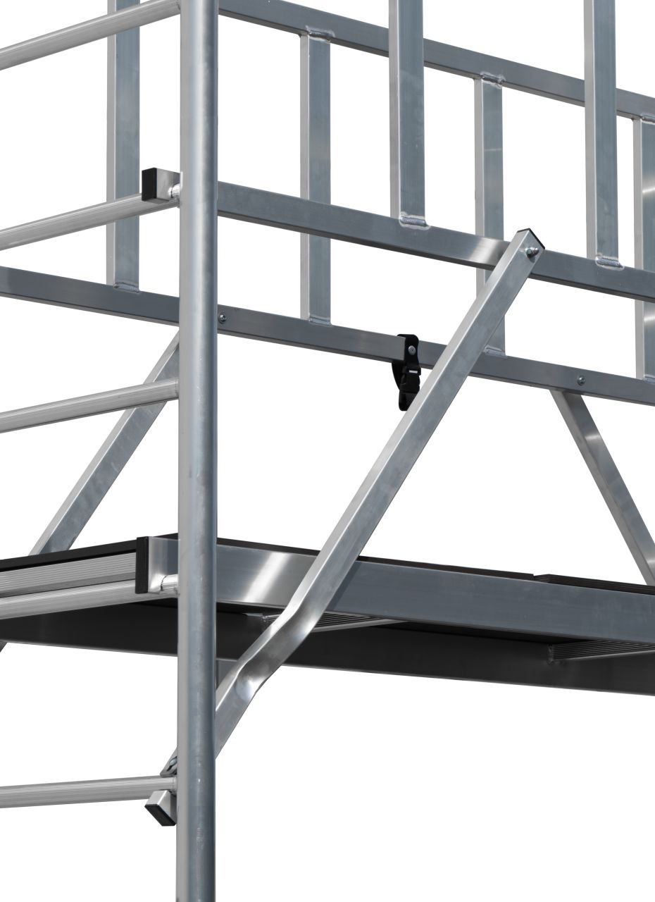 + Die Integration der Diagonalen in das GuardMatic-System gewährleistet eine einfache und sichere Montage. Für Transport oder Lagerung kann der Geländerrahmen platzsparend zusammengefaltet werden.