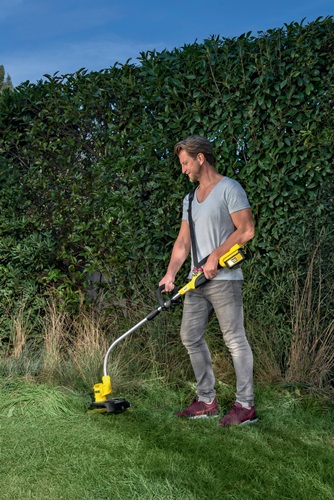 Unwirtliche Ecken gibt es in jedem Garten überall dort · wo man mit dem Rasenmäher nicht gut hinkommt oder eine angrenzende Hauswand oder ein Strauch im Weg sind. Für Arbeiten in solch verwinkelten Ecken braucht es ein kleines · flexibles und auf jeden Fall leistungsstarkes Gerät: einen Rasentrimmer von Kärcher. Dieser enthält einen gedrehten Schneidfaden · der per automatischem Fadennachschub auf der Fadenspule konstant nachgestellt wird. So ist bei jedem Schnitt stets die perfekte Länge des Trimmerfadens gegeben und saubere Schnittergebnisse sind garantiert. Besonders angenehm ist dabei · dass das Arbeiten sehr geräuscharm vonstattengeht und die Fadenspule werkzeuglos mit wenigen Handgriffen gewechselt werden kann. Und weiter geht’s · den letzten Grashälmchen auf der Spur.