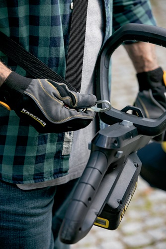 Der ergonomische Schultergurt ermöglicht längeres · ermüdungsfreies Arbeiten mit verschiedenen Kärcher Akku-Gartengeräten. Er lässt sich bequem tragen und entlastet den Anwender. Kompatibel mit den Unkrautentfernern WRE 4 Battery · WRE 18-55 · den Laubbläsern und -saugern BLV 36-240 und BLV 18-200 sowie weiteren Akku-Gartengeräten.