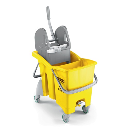 Der Fahreimer mit Doppelkammer von Kärcher ermöglicht dank der sinnvollen Trennung von Reinigungslösung und Schmutzwasser beste Reinigungsergebnisse bei der Bodenreinigung in mittelgroßen und großen Objekten. Dank Doppelgriff und 80 Millimeter großen Rädern lässt er sich dabei besonders einfach manövrieren und transportieren. Die professionelle Backenpresse sowie der Presshebel des Doppelfahreimers sind ergonomisch optimal platziert und sorgen ebenso für rückenschonendes Arbeiten wie die Auslauftöpfe zum Entleeren · ohne dabei den Eimer anheben zu müssen. Die glatten Oberflächen des Doppelfahreimers aus recycelbarem · langlebigem und natürlich rostfreiem Polypropylen sind dazu besonders einfach hygienisch sauber zu halten.