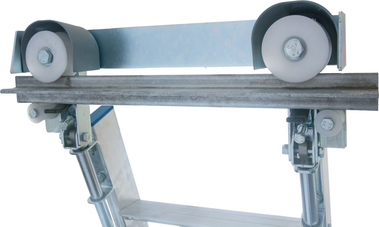 Kopffahrwerk für Regalleiter an Alu-Rundrohr-Schienenanlage