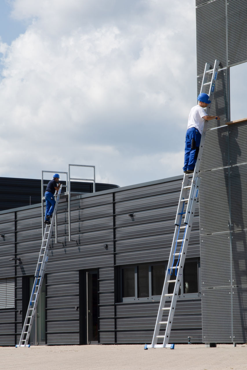Leichte, zweiteilige, professionelle Aluminium-Mehrzweckleiter mit Stufen/Sprossen-Kombination für TRBS 2121-2-konforme Anwendung. Verwendbar als Anlege- und Schiebeleiter mit Quertraverse. Das Stufenleiternteil der Stehleiter kann ebenfalls als Arbeitsplatz verwendet werden. Durch die neue, innovative Stufen/Sprossen-Kombination in einer Leiter kann diese, je nach Aufstellart, als Verkehrsweg und als Arbeitsplatz verwendet werden.