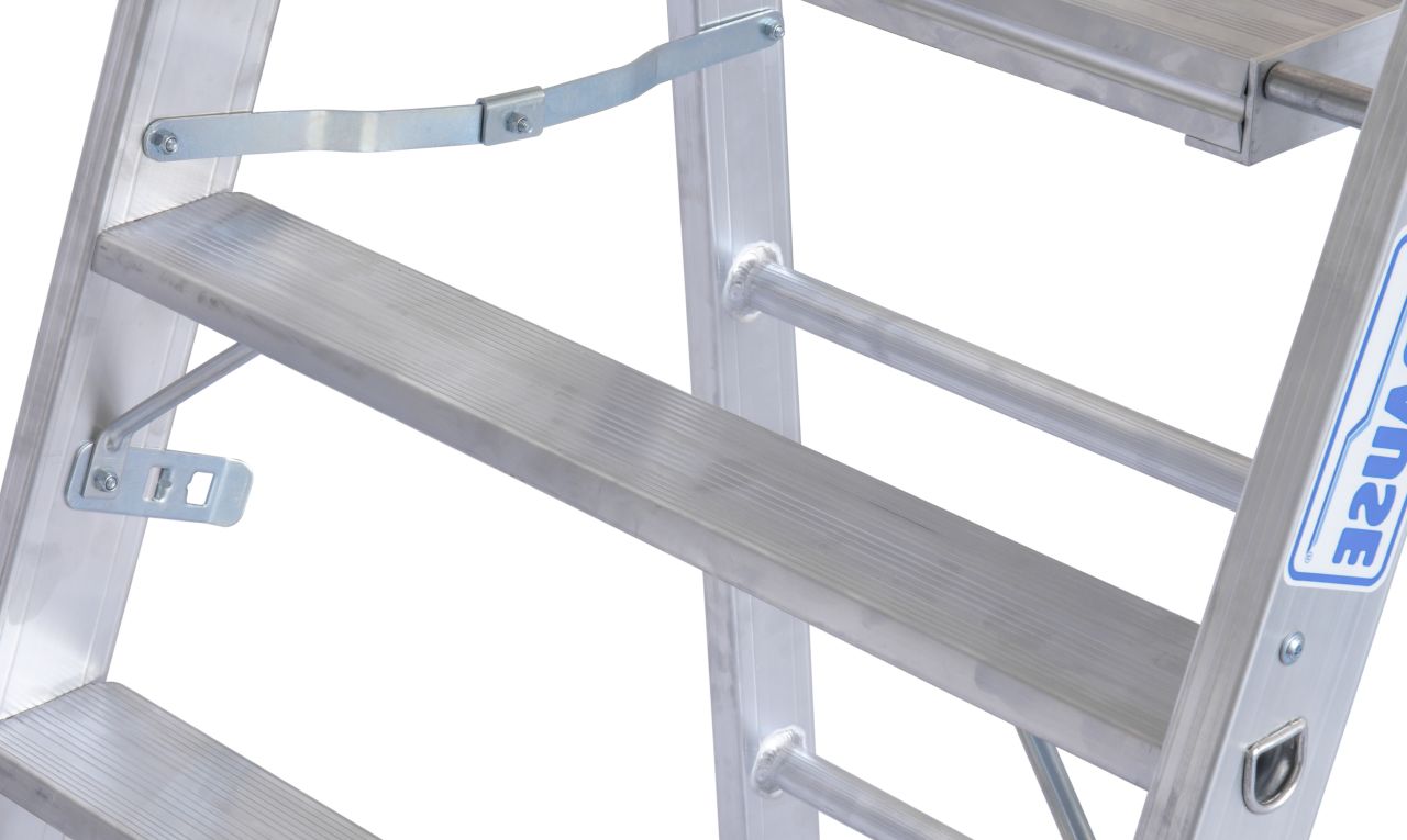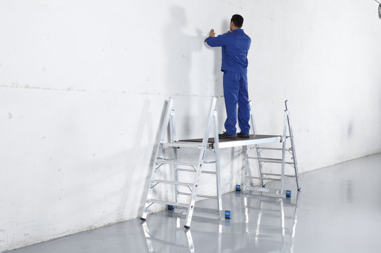 - Doppelfunktion: Tritt mit integrierter Einhängemöglichkeit für Belagbühnen (1,5 – 2,0 m lang) zur Erstellung einer großenArbeitsfläche