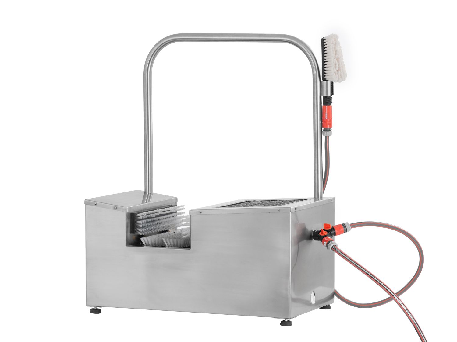 OSMA Stiefelwaschanlage aus Edelstahl mit tiefer liegenden Bürsten und Sprühdüsen und einem höherliegenden Gitterrost und Schaftreiniger mit Handbürste.