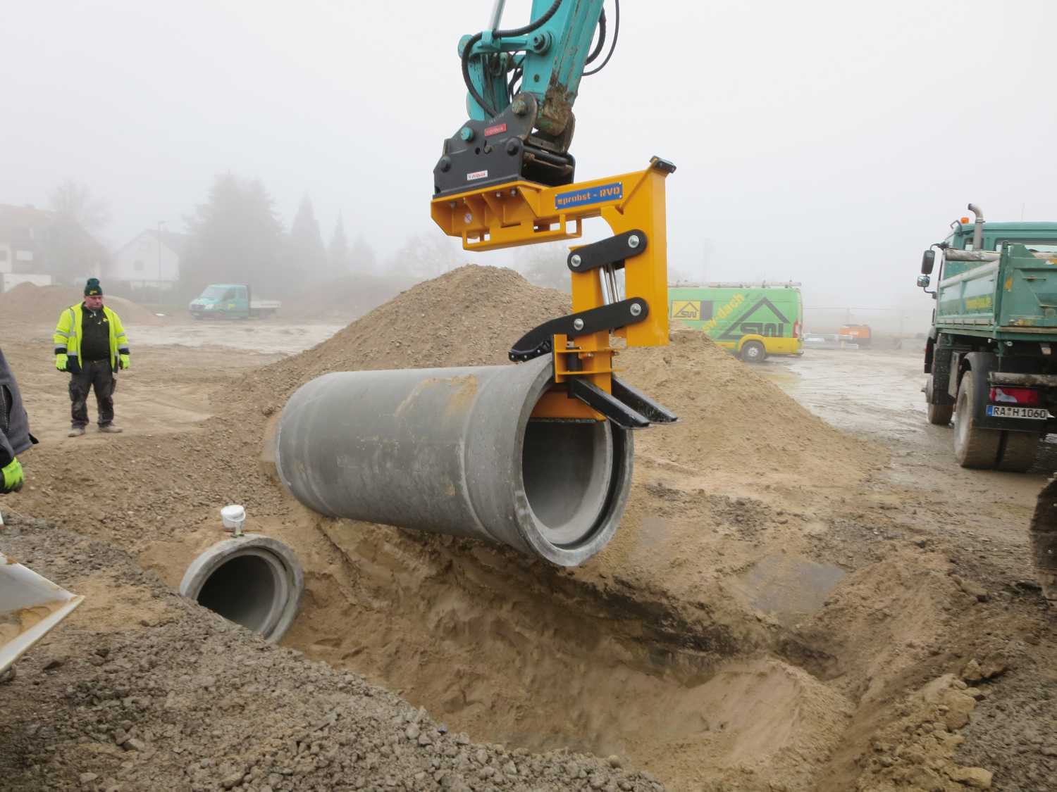 Die universelle Rohrverlegehilfe zum Entladen, Transportieren und Verlegen von Stahlbetonrohren (z.B. Kanalrohre).